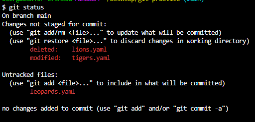 git status로 다시 확인해보면, lions가 삭제됐고, tigers가 변형되었고, leopards가 추가된 것을 알 수 있다.