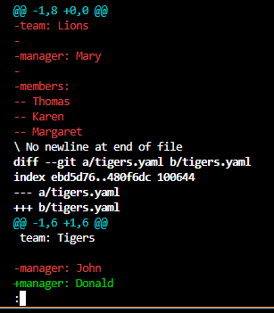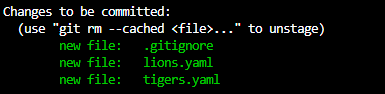 lions.yaml은 삭제하고, leopards.yaml을 추가했다. 옆의 알파벳을 보면, 새로 추가된 파일은 U, 변형된 파일은 M으로 나온다.