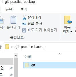 백업해뒀던 .git 파일을 다시 git-practice에 복사하고, git reset --hard 명령어를 사용해서 원점으로 돌아와보자.