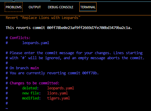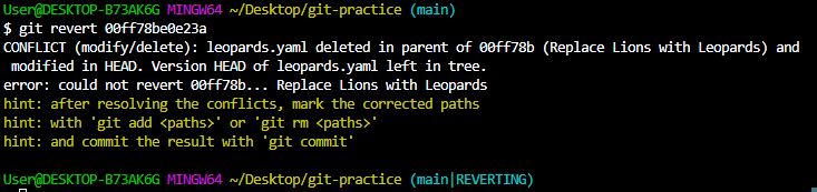 그럼 Bash는 add를 하던 rm을 하던지 해서 revert를 다시 진행해라고 힌트를 준다.