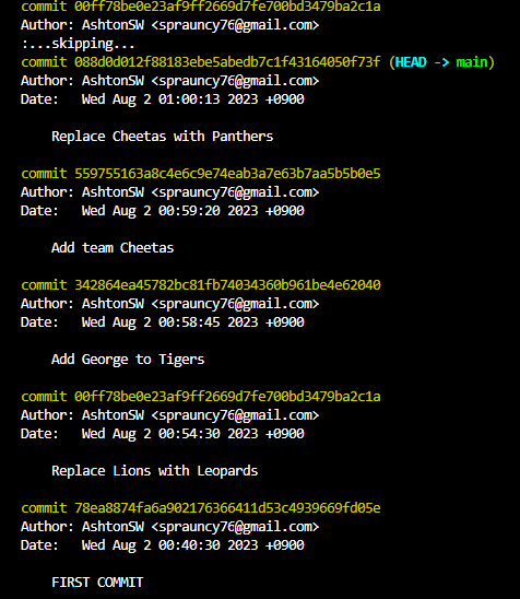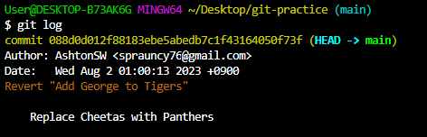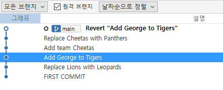 Revert는 되돌리기 원하는 시점의 커밋을 거꾸로 실행한다. 따라서 결과적으로 아래와 같이 되면, Add team Cheetas로 돌아가게된다.