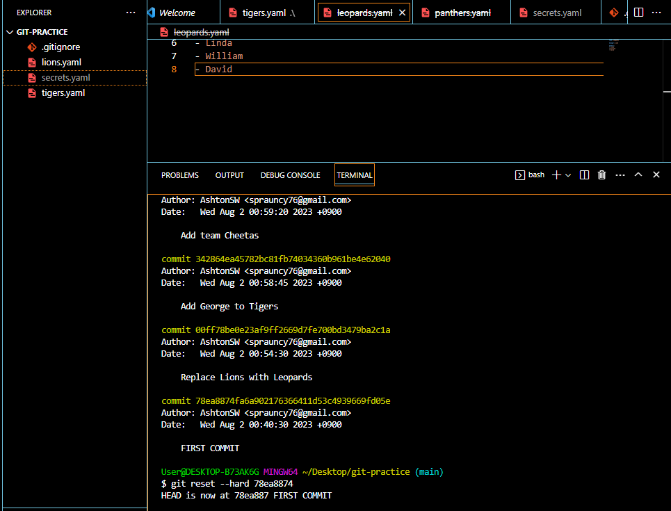 Panthers가 삭제되었고, 파일의 내용도 과거로 돌아간 모습을 확인할 수 있다.