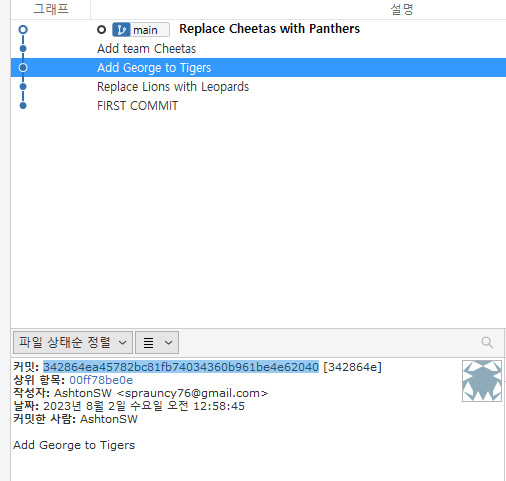 만약 Add George to Tigers의 커밋해시를 구해보자.