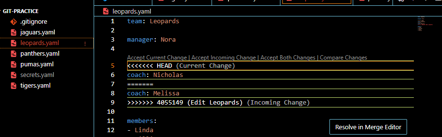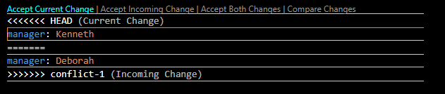 vscode에서는 위와 같이 알려준다. 충돌이 난 부분들이 여러 개 있고 editor에서 "<<<<"를 검색해서 충돌한 부분을 찾을 수 있다. Accept Current Change를 누르면 현재의 내용으로 결정된다. Accept Incoming Change는 아래의 부분, Both는 양쪽 다 남는다.