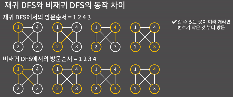 재귀적인 방식은 실제 방문할 때 방문 표시를 남기지만, 비재귀적 방식은 방문하기 전에 아직 방문하지 않은 곳을 발견하면 그 때 방문 표시를 남기기 때문에 위와 같은 차이가 발생한다.