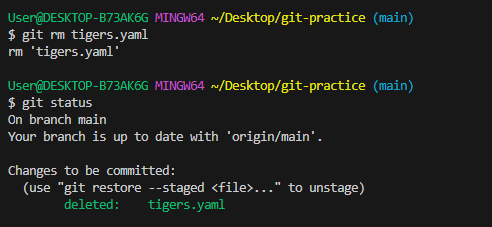 그냥 파일을 삭제하고 난 뒤 git status로 확인해보면, 파일의 삭제가 working directory에서 작업됐다고 나온다.