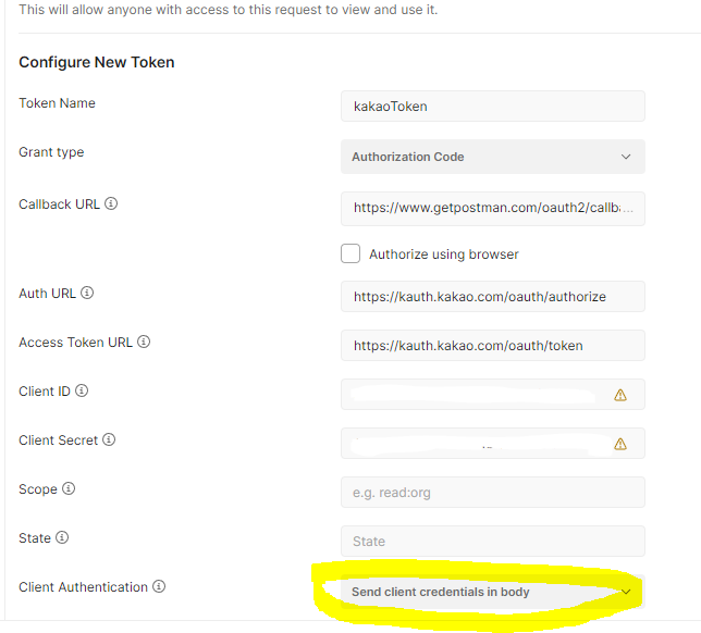 즉, Send Client credentials in body로 설정하는 것이 맞는 설정이다.