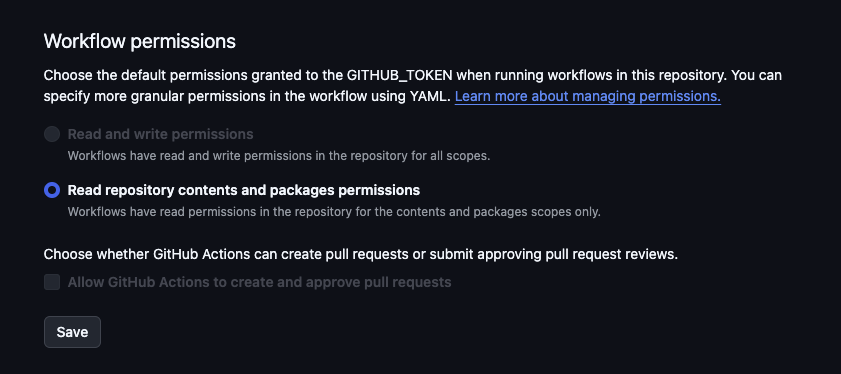 레포지토리 -> 세팅 -> actions -> general 에 들어가서 권한을 확인했고, 아래와 같았다.
