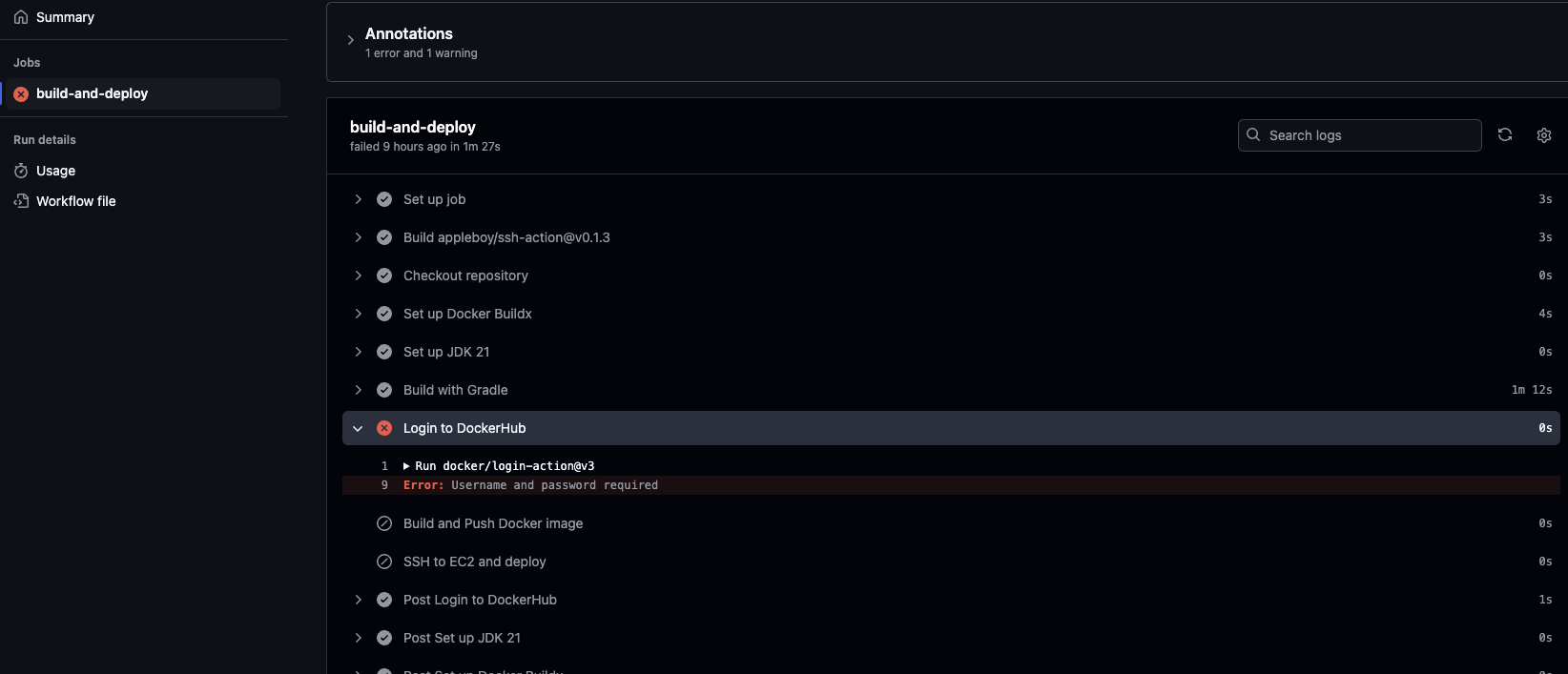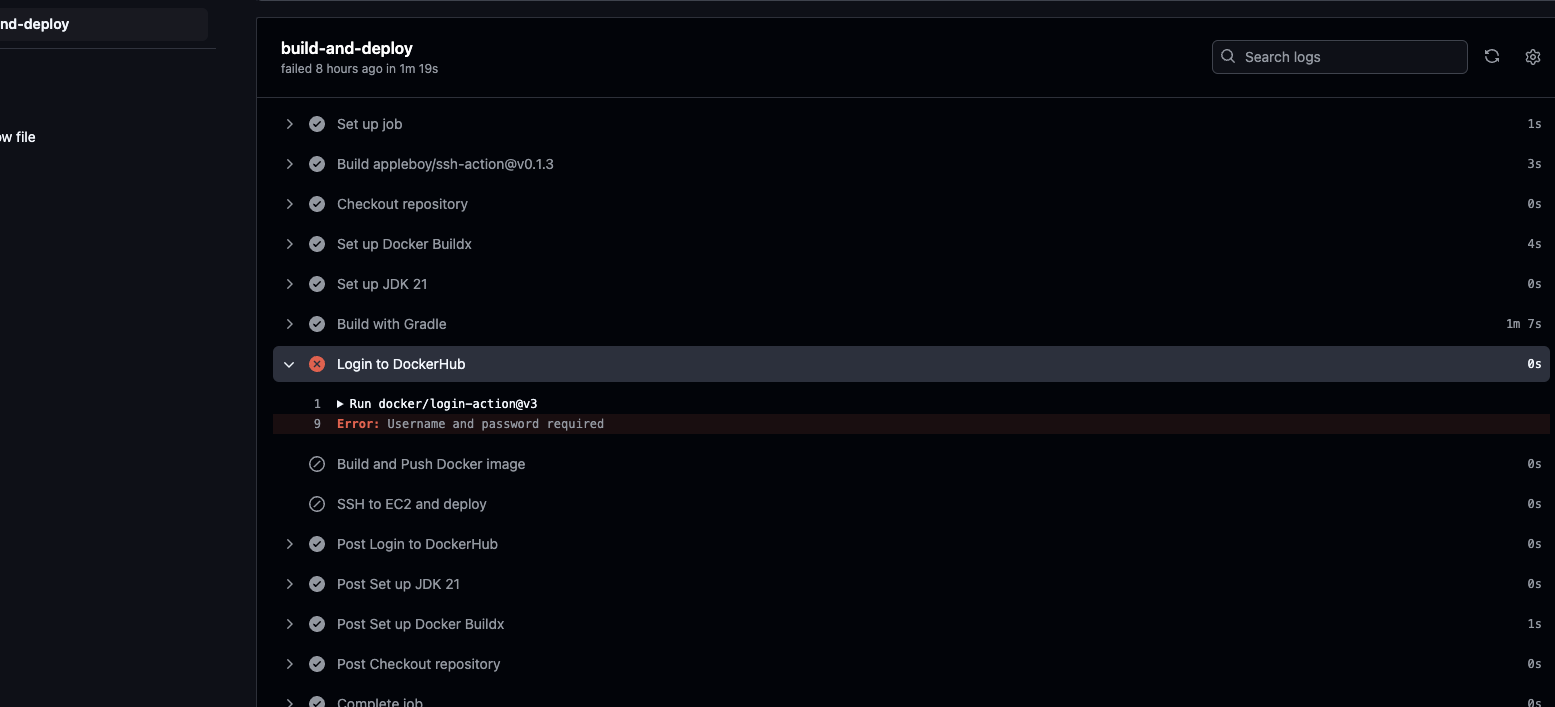 그런데, Error: Username and password required 에러가 뜨면서 CI/CD 파이프라인이 실패했다.
