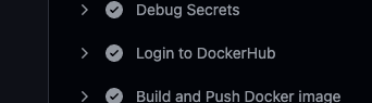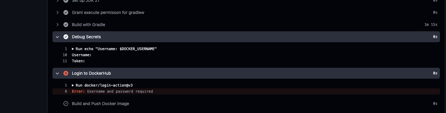 그래서 secrets에서 잘 값을 받아오는지 확인하기 위하여 DOCKER_USERNAME과 DOCKER_TOKEN 환경 변수로 DOCKER_HUB_USERNAME 및 DOCKER_HUB_ACCESS_TOKEN의 값 확인을 직접 디버깅해서 확인해보기로 했다.