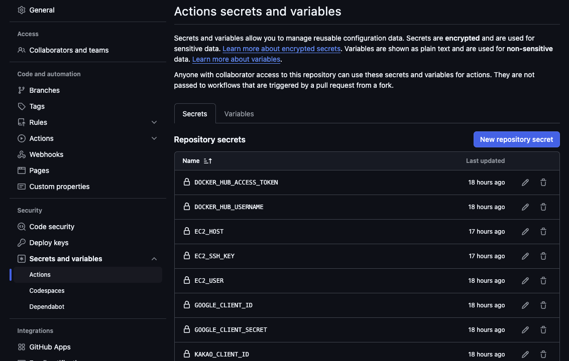 어차피 백엔드에서만 쓸거니까 일단 Organization에 생성할 필요가 없어 보였고, Repository secrets에 새로 다시 입력했다..