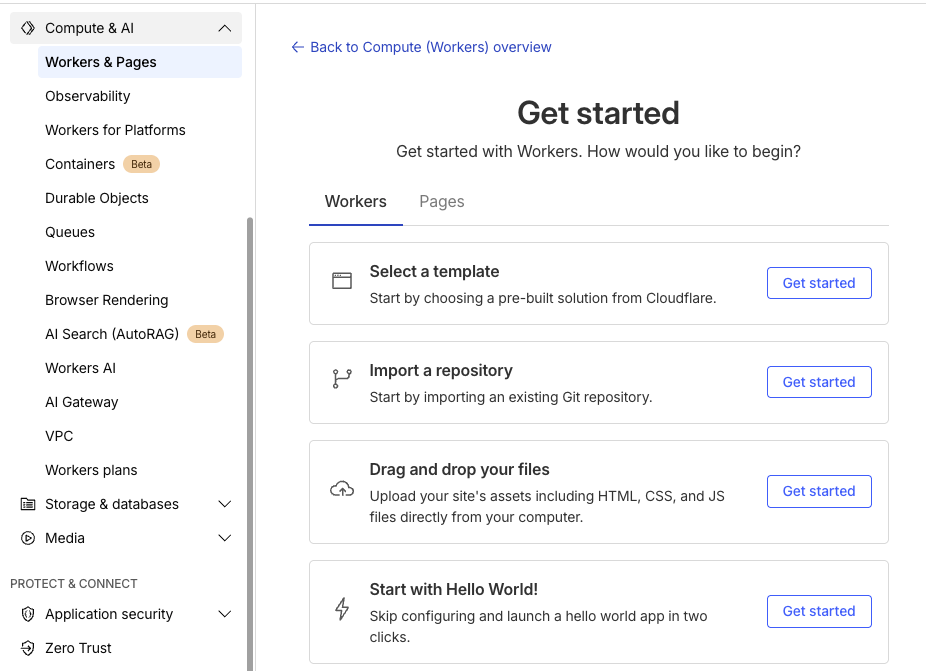 - Workers & Pages 누르면 Get started 화면 나옴 → start with Hello World! 클릭